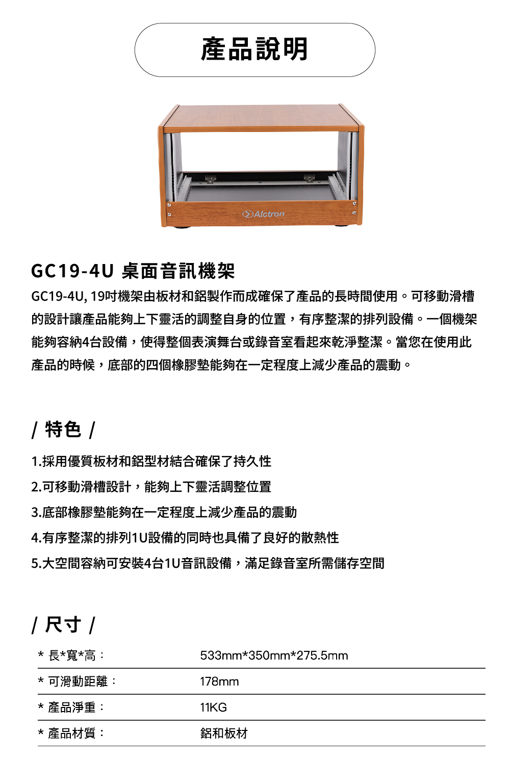 • 採用優質板材和鋁型材結合確保了持久性。 • 可移動滑槽設計,能夠上下靈活調整位置。 • 底部橡膠墊能夠在一定程度上減少產品的震動。 • 有序整潔的排列1U設備的同時也具備了良好的散熱性。 • 大空間容納可安裝4台1U音訊設備,滿足錄音室所需儲存空間。