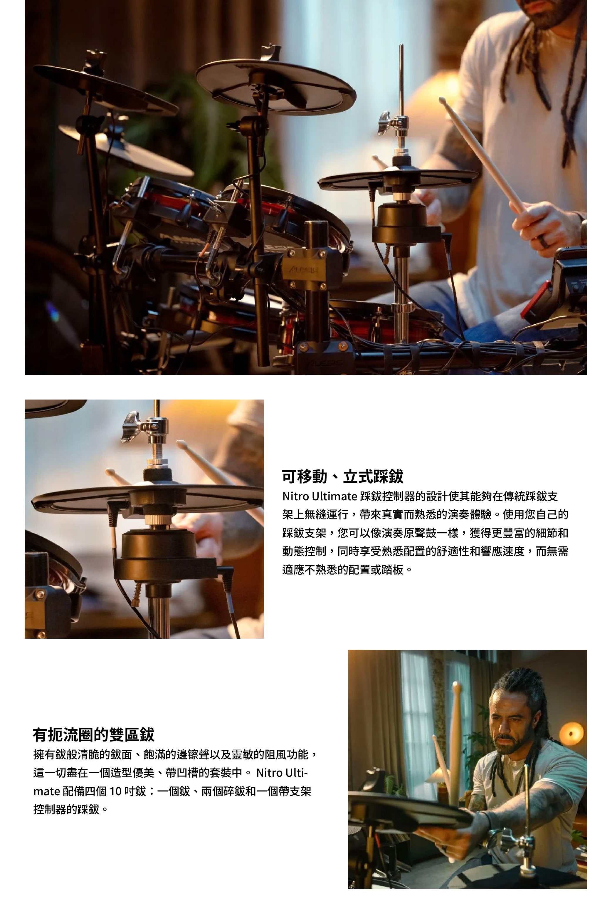 鈸: 包含一個 10 吋 Ride 鈸、兩個 10 吋 Crash 鈸(皆具備雙區和悶音功能),