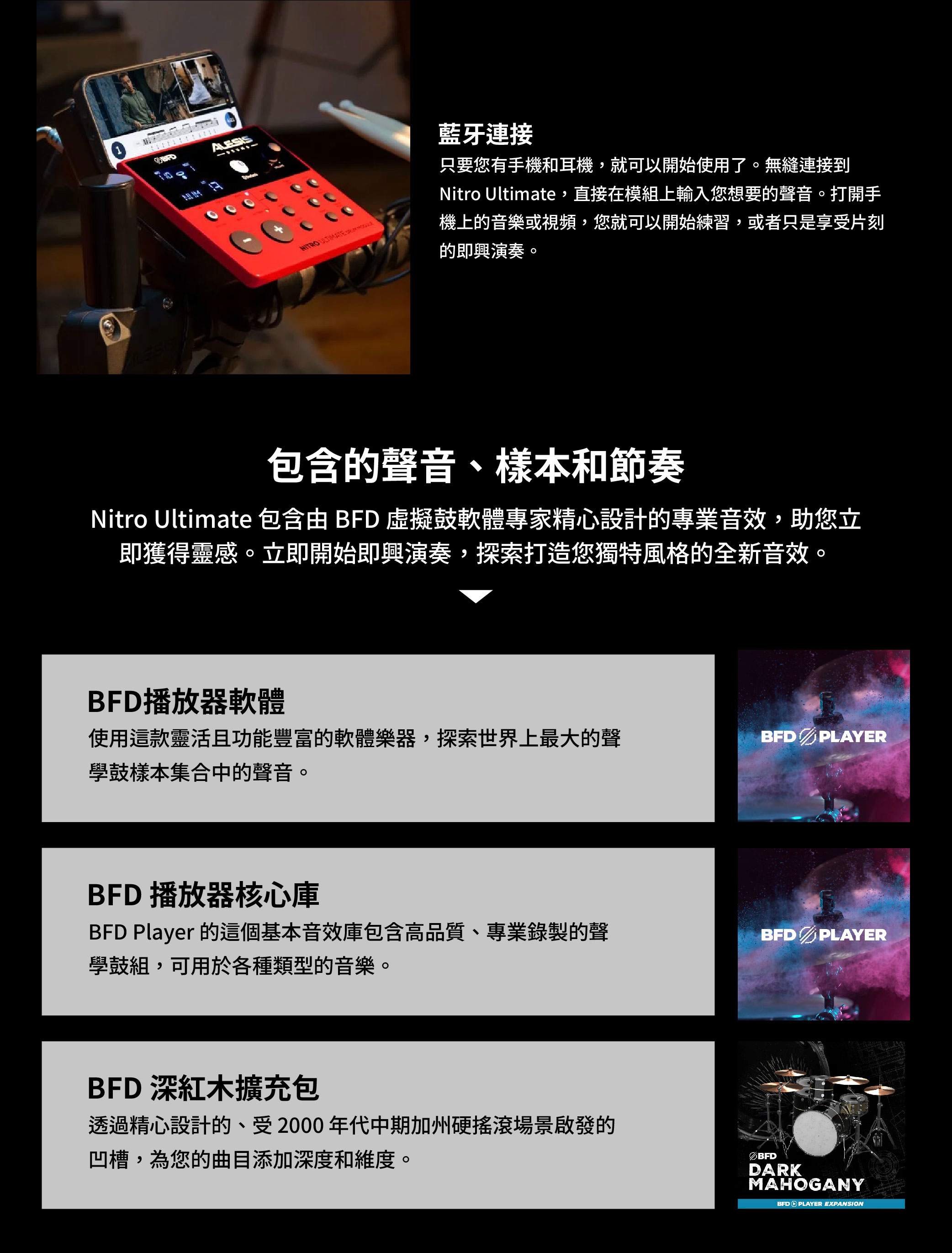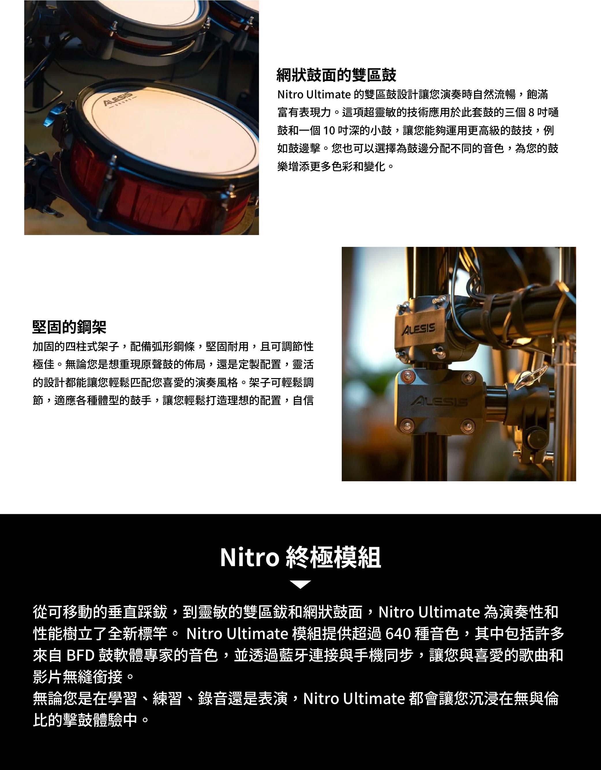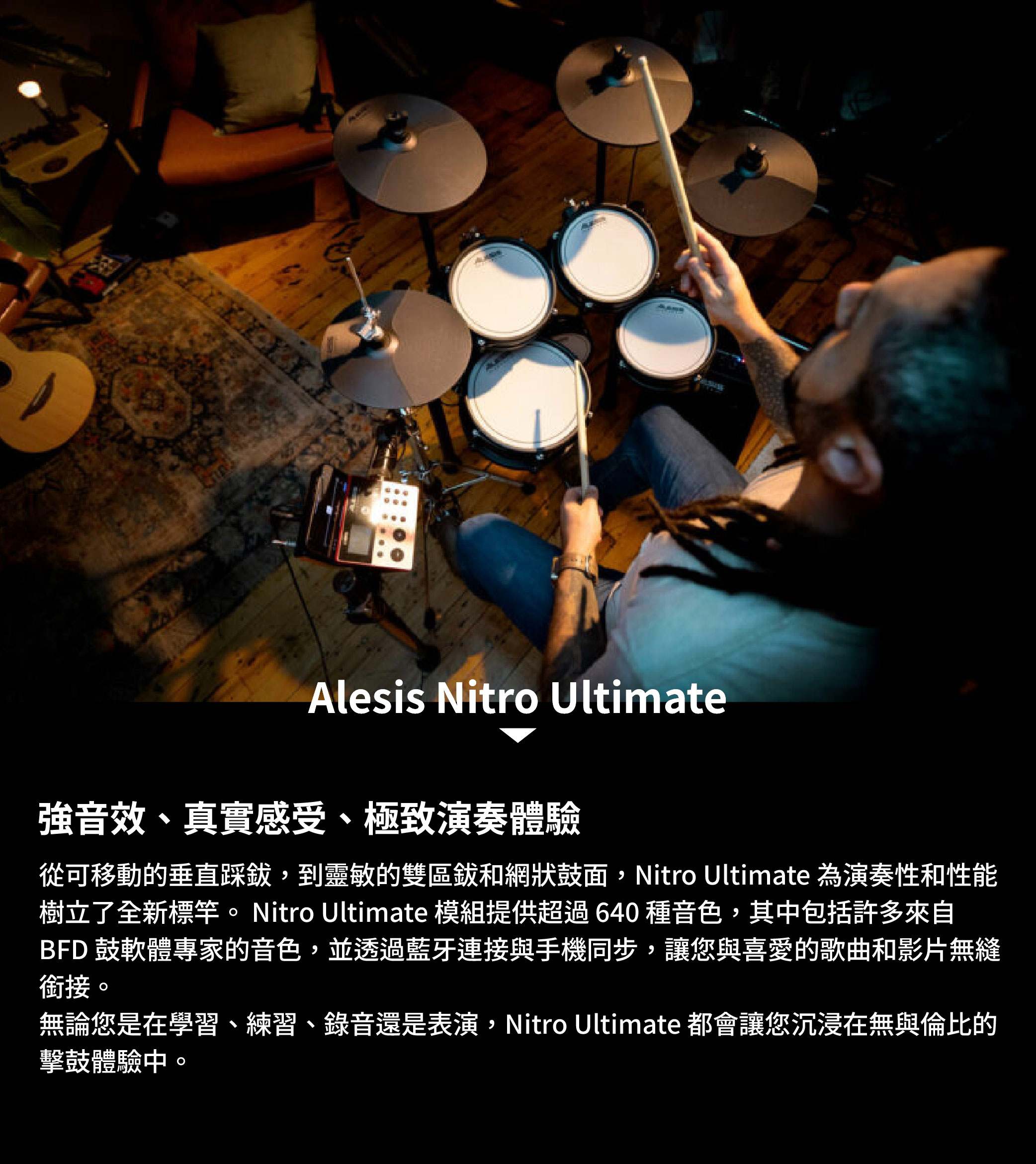 Alesis Nitro Ultimate 是一款九件式電子鼓組,專為不同階段和技能水平的鼓手設計。