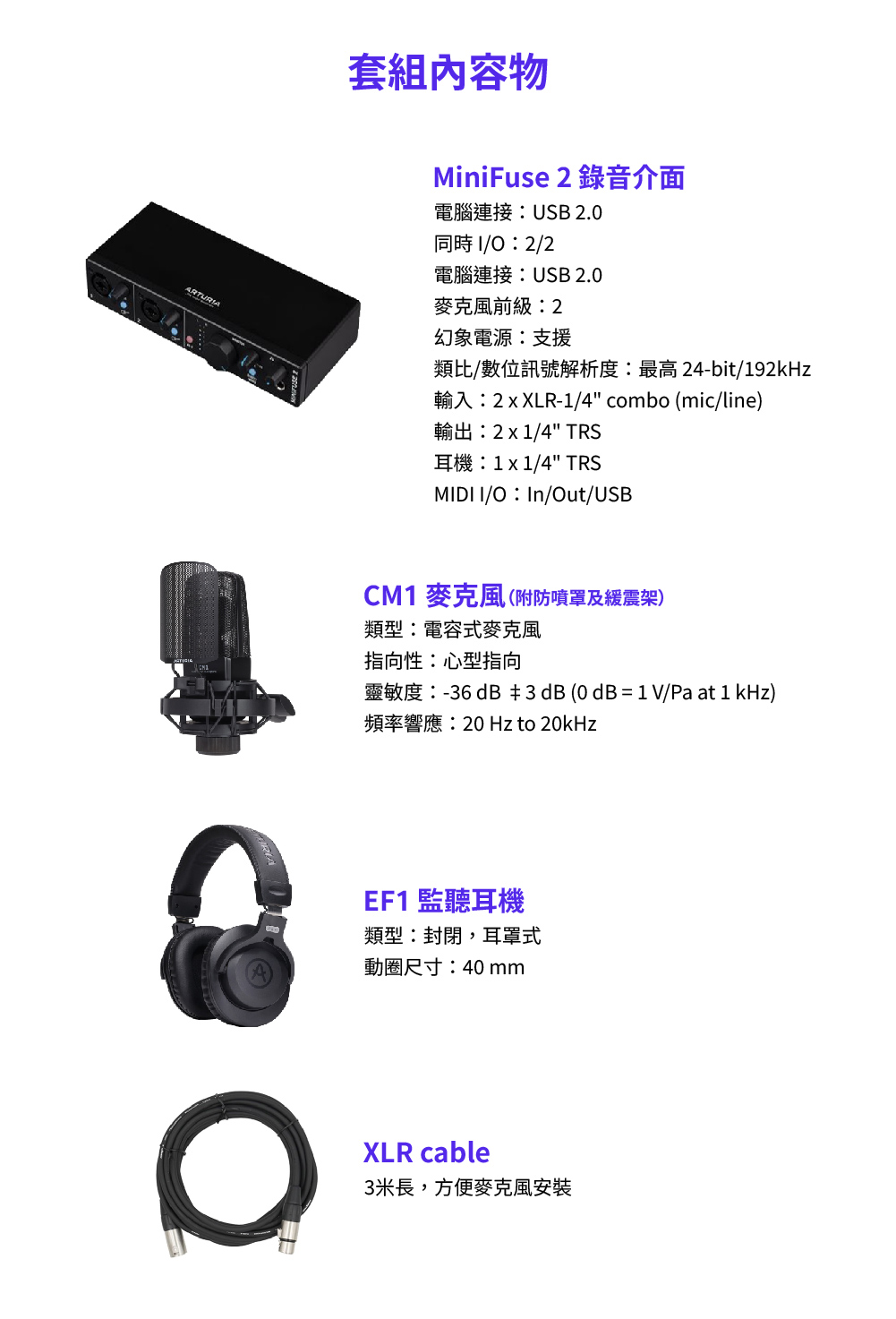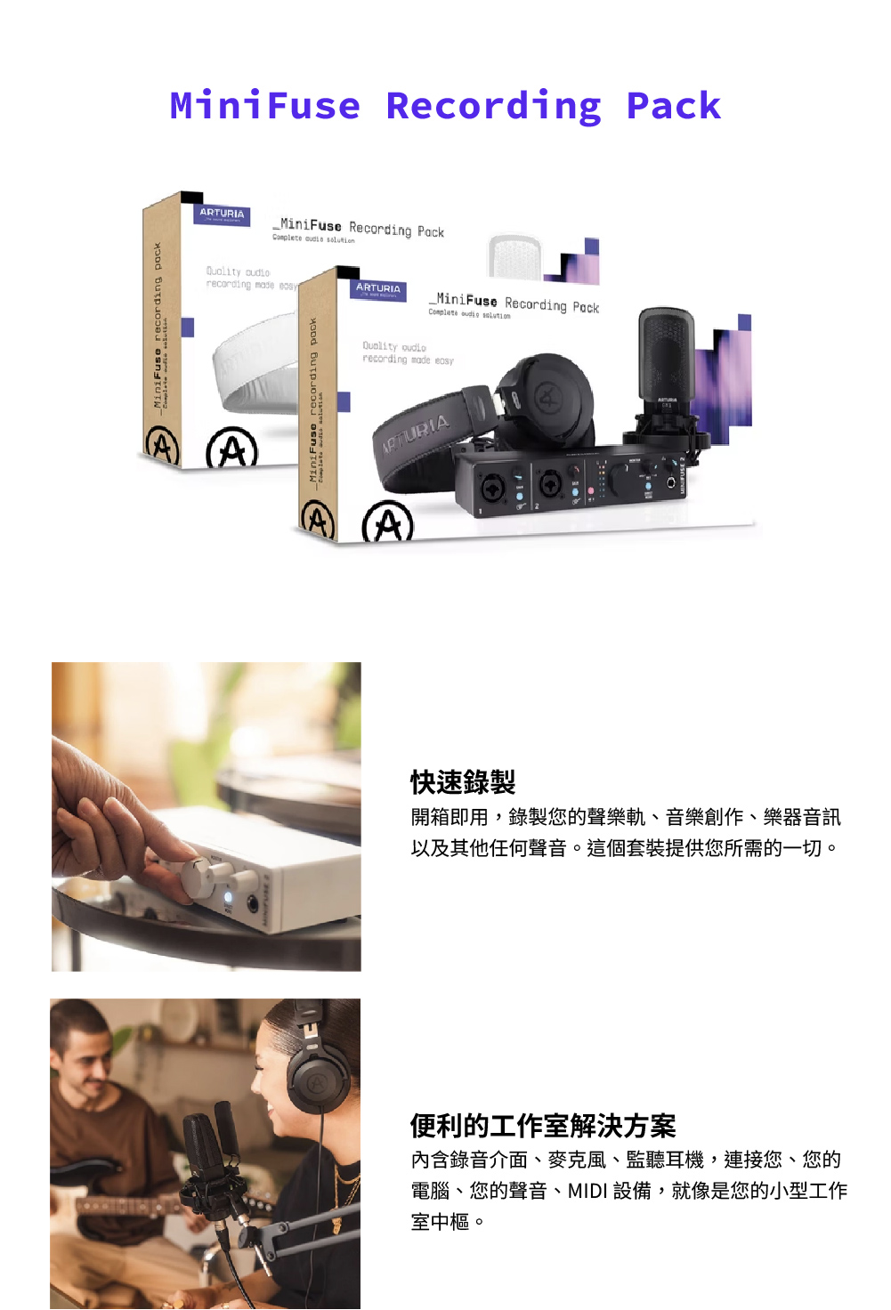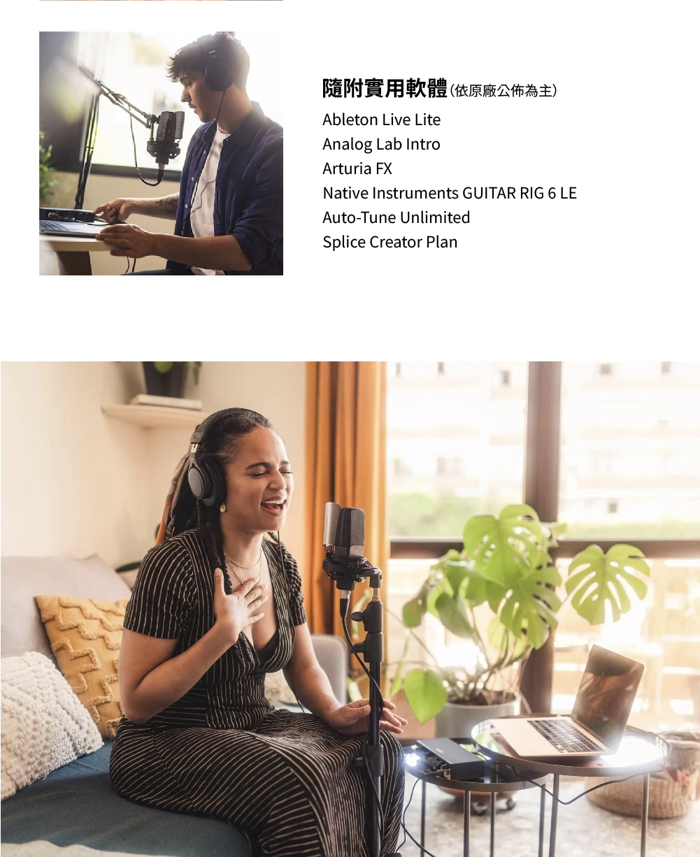 這套由法國音訊大廠 Arturia 推出的錄音套裝,專為歌手、樂手與 Podcast 創作者量身打造。 內含高品質錄音介面、專業電容麥克風與監聽耳機,搭配總價值超過萬元的強大音樂製作軟體包, 讓您在家就能開啟專業錄音室等級的創作體驗。