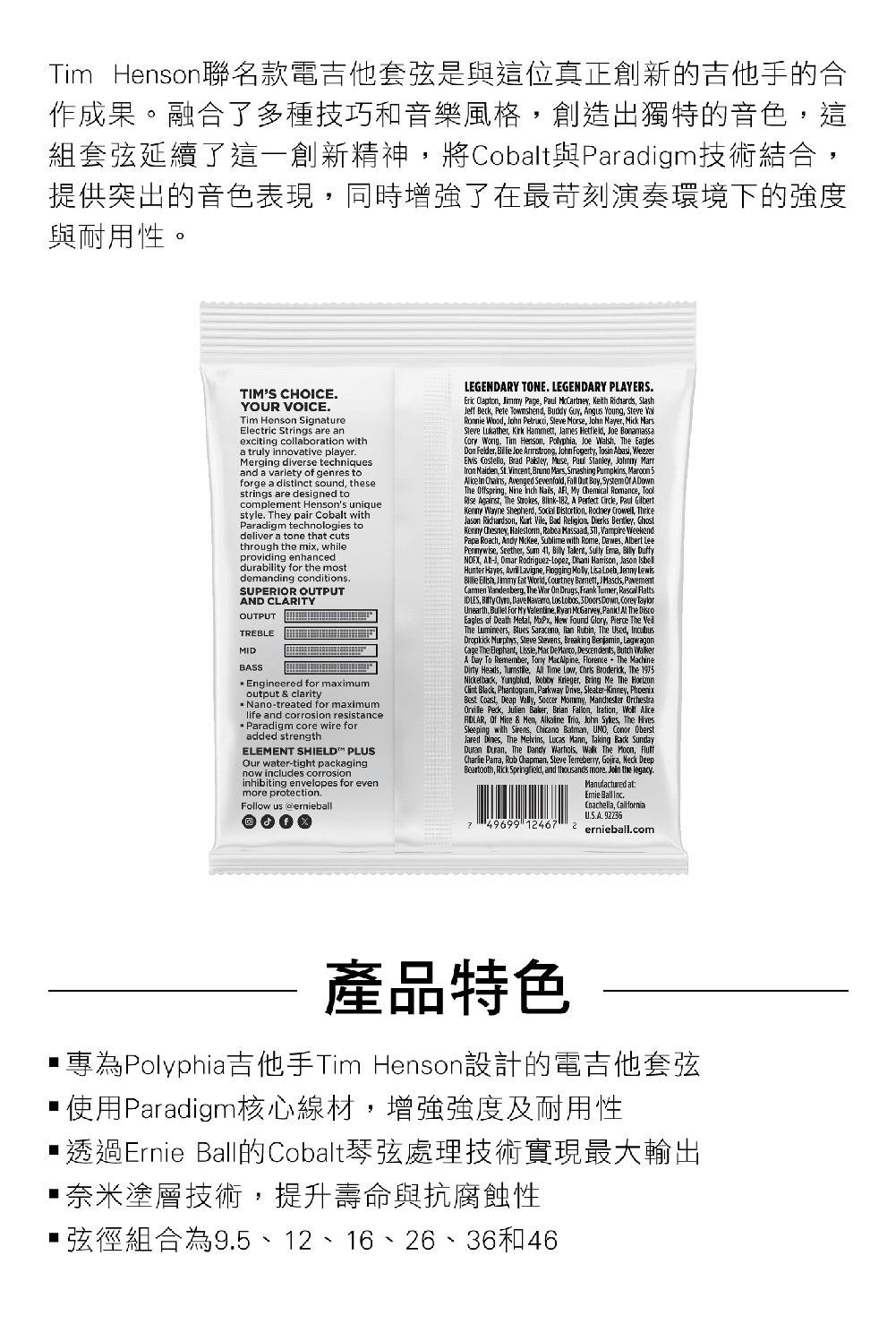 ● Ernie Ball專為Polyphia吉他手Tim Henson設計的電吉他套弦 ● 使用Paradigm核心線材,增強強度及耐用性 ● 透過Ernie Ball的Cobalt琴弦處理技術實現最大輸出 ● 奈米塗層技術,提升壽命與抗腐蝕性 ● 特殊的弦徑組合為9.5、12、16、26、36和46 ● P03826