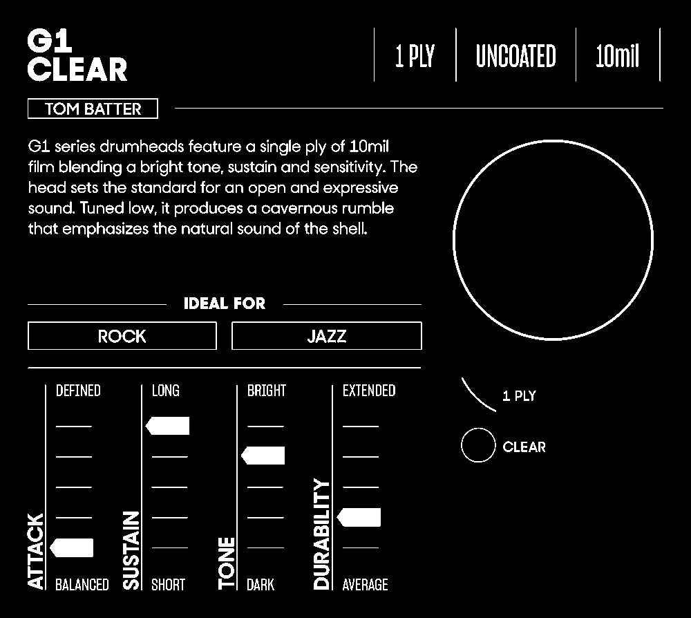 Evans G1 採用單層 10mil 薄膜,融合了明亮的音色、極佳的延音與靈敏度, 為開闊且具表現力的聲音樹立了標竿。將其調低音高可獲得深邃的轟鳴聲, 進而強調鼓肚本身的自然音色。這款鼓皮導入了 Evans Level 360 技術, 使其易於調音,並擁有更廣的音高範圍與卓越的音質。
