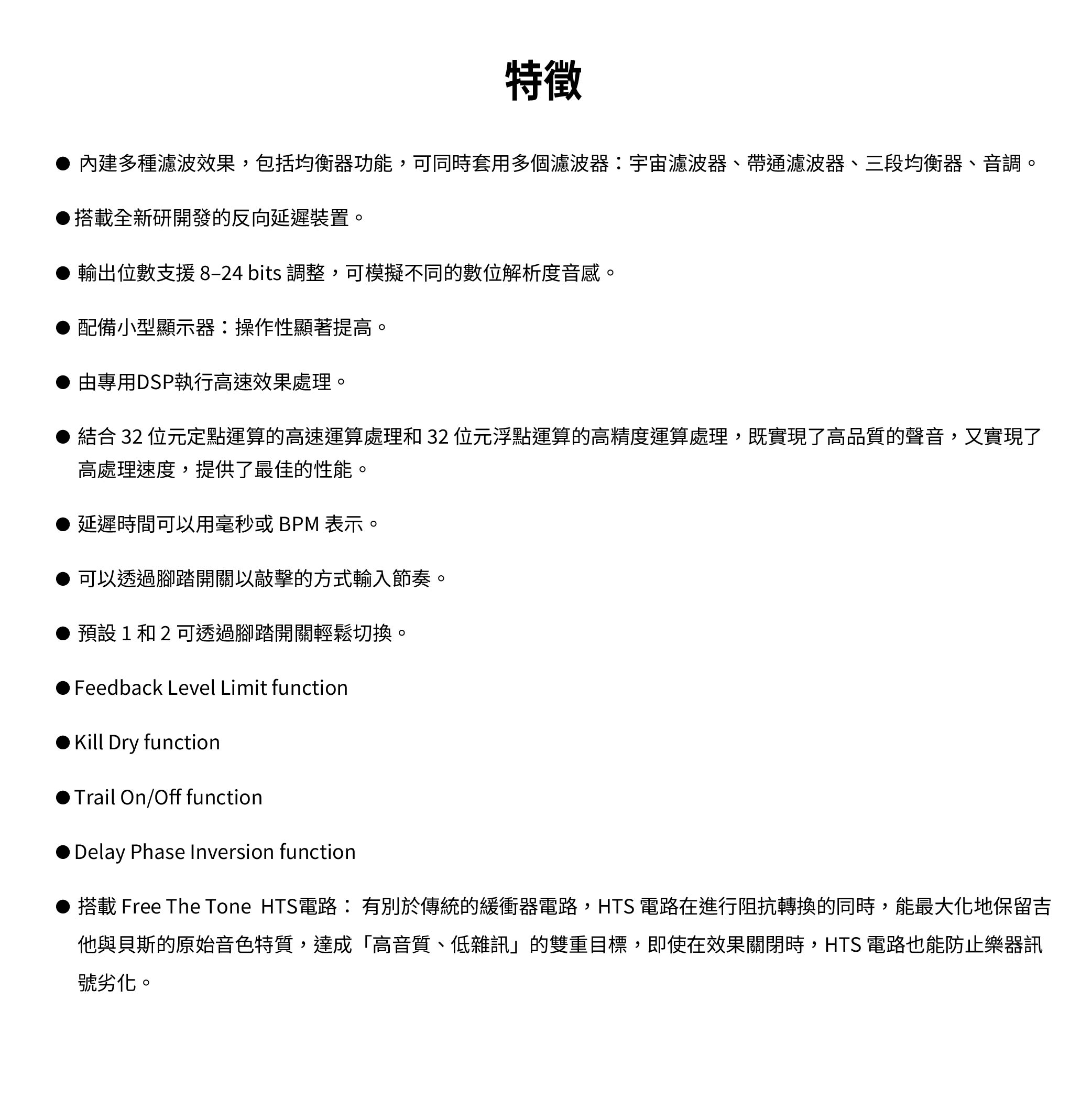 本機搭載多重濾波功能,可將延遲聲塑造成厚實溫暖的音色,或反向調整為更具個性的音色。