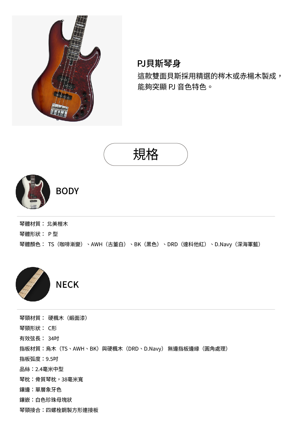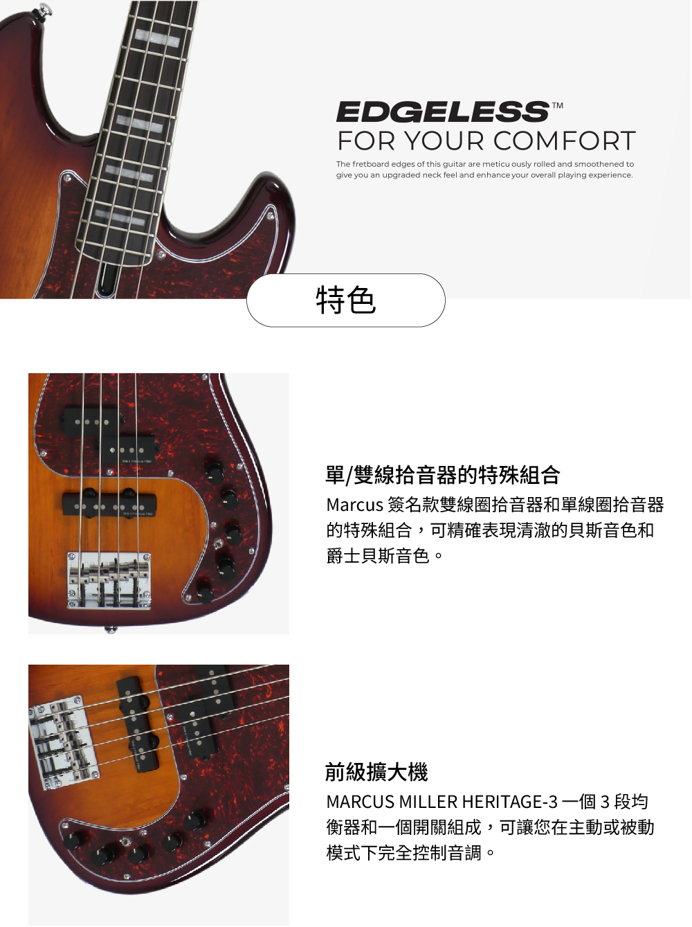 Sire 貝斯的「整合」概念始於 P7,它是該系列中第一個具備 P+J 特性的型號。 憑藉 Marcus 簽名款拾音器組,這款BASS能夠同時產生清晰的(Precision)貝斯音色和經典的爵士 (Jazz)音色。它出廠時配備了 DR Dragon Skin+DBQ-45 貝斯弦。