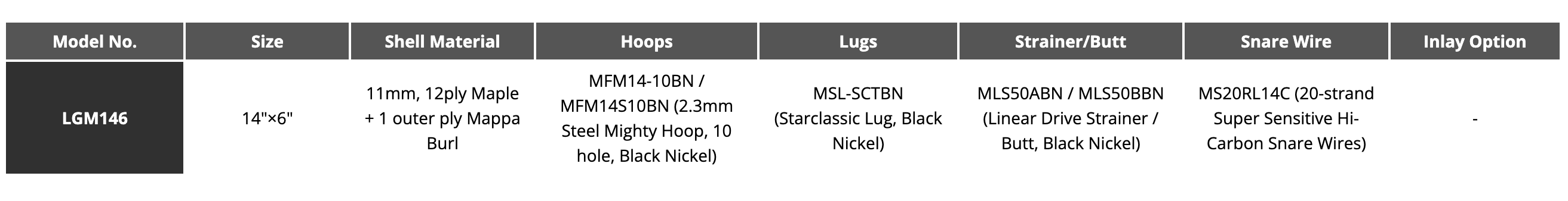 LGM146 KMB 是 6”x 14" 的 G-Maple 小鼓. 採用13層 厚度11mm